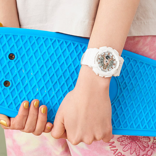 手錶設計靈感取自熱銷的G-SHOCK GA-110,搭配上清爽鮮明的配色,保證魅力無法擋。錶盤、指針刻度以及其他要素的巧妙組合,勾勒出機械齒輪帶來的美感,再搭配上些許銳利的設計格調,為手錶增添無限活力。這款BABY-G不僅具備鮮明的街頭風格,實用功能也不打折扣。LED燈照明、碼錶以及有口皆碑的耐衝擊、防水效能等多種實用、可靠功能,讓您的各種使用需求一次獲得滿足。