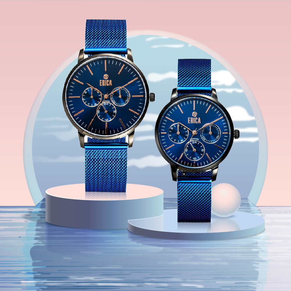 ERICA STORE 時尚時計-輕奢華刻度三眼不鋼帶米蘭錶帶情人對錶-藍邊黑框(ER-22-ABM/ER-22-ABL)