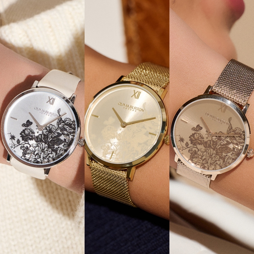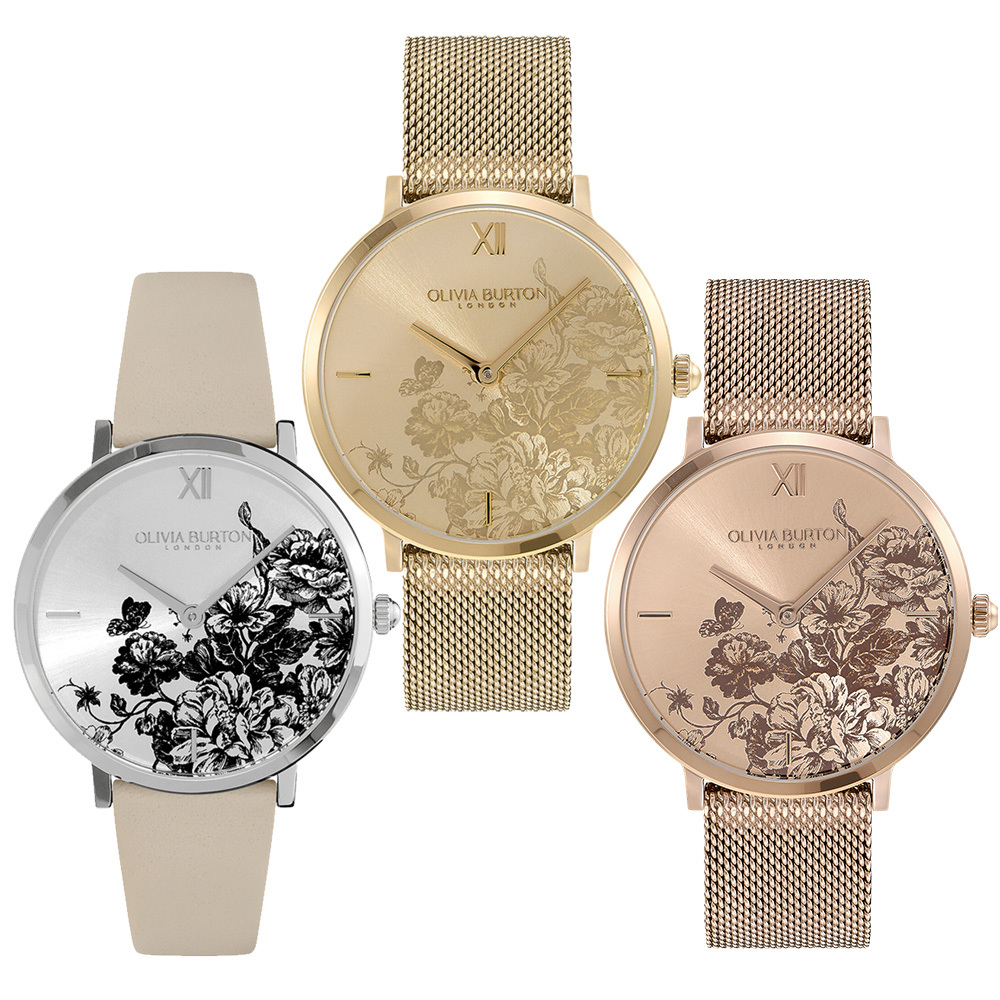 美麗的英式花卉在淺金色太陽紋錶盤上綻放。