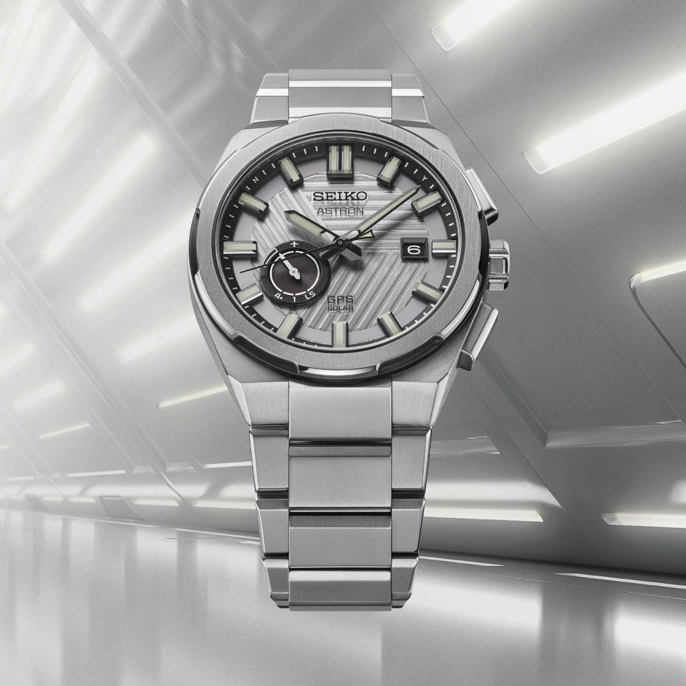 錶殼、錶帶與面盤統一使用銀色調,呈現太空船艙室的金屬質感。